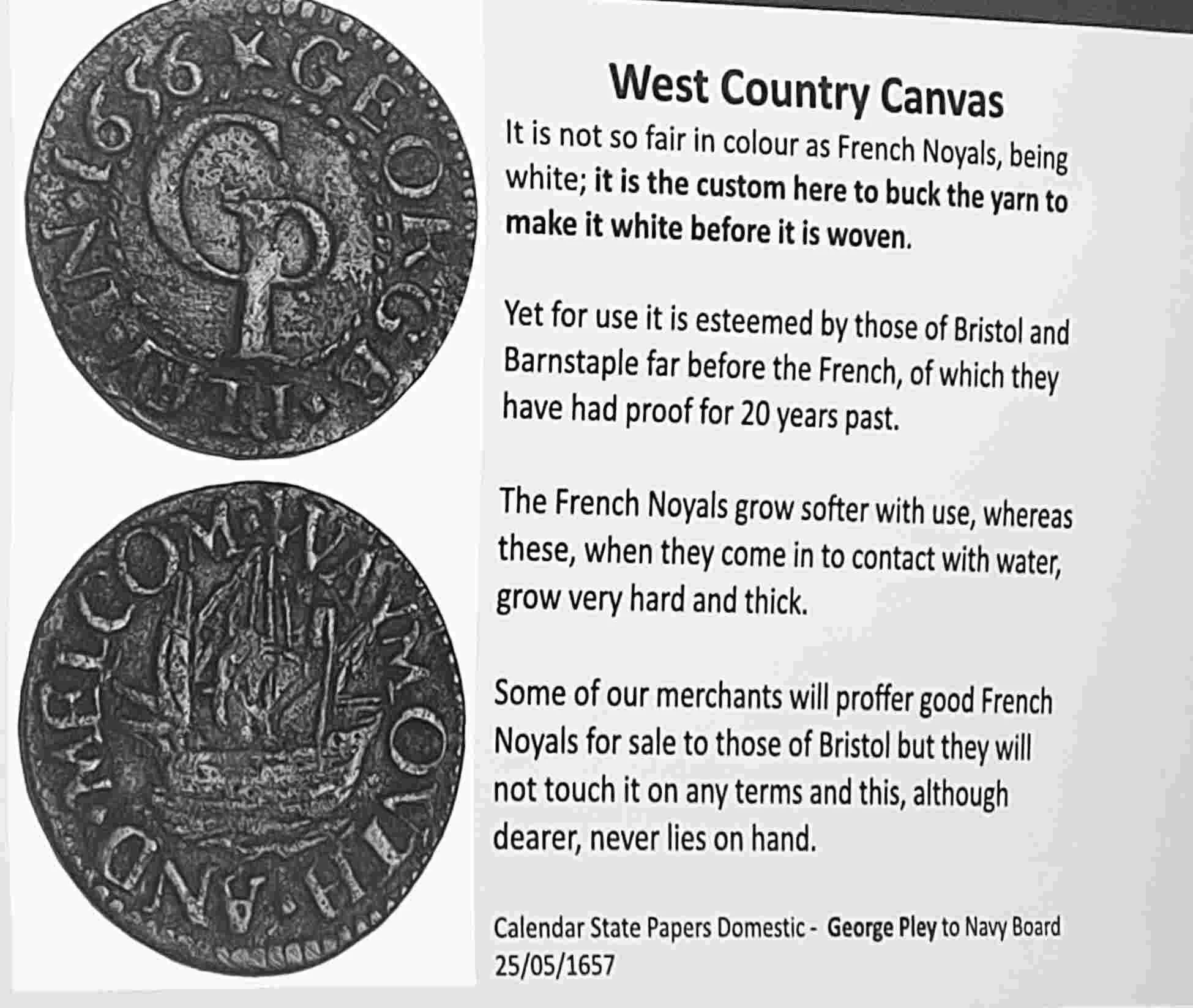 Sailcloth, also known as canvas, was made in other parts of the country but none was as long-lasting as that from West Coker, where the linen yarn was ‘bucked’. Bucking involved boiling the yarn/twine in a solution of potash, which whitened and strengthened both the yarn and resulting cloth, (see the quote from the Calendar State Papers in the accompanying photo). However, this reduced its mass by a quarter, thus making it more expensive to produce. West Coker’s ‘bucked-in-the-yarn’ sailcloth was eventually proved superior and longer lasting than both Dundee sailcloth and even the prized French ‘Noyals’. In 1634 John Giles of Coker made the sailcloth for the ‘Sovereign, for which he had to weave thirty yards a week by hand. After weaving, the Coker canvas was shaped and sewn into sails in big sail lofts in Crewkerne. In 1812, once it was proved to last 47% longer than other sailcloth, Coker canvas was adopted by the Admiralty for the sails of the fleet, but the boom did not survive the demise of sail in the late 1800s. Following this, Coker canvas continued to be used for the sails of the racing ships in events such as the Americas Cup.