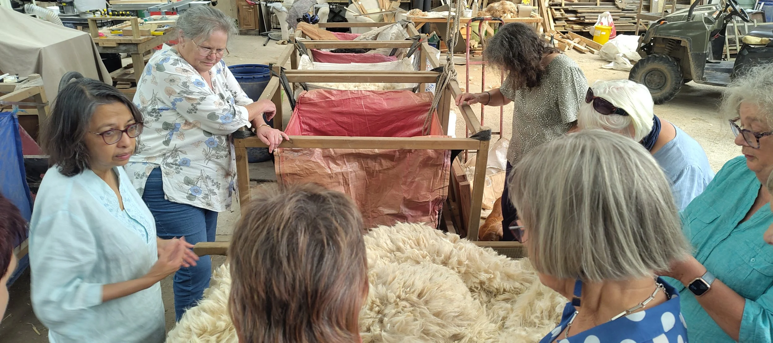 The design studio's knitwear production is a blend of designer commissions and that of their own British Alpaca Fashion range. The machines we saw were both Japanese Shima Seiki computerised, digital machines, a Wholegarment and an SRY. Sami demonstrated setting up the yarn on the machine and knitted a wholegarment whilst we enjoyed a delicious lunch provided by Anila. Everyone was amazed that this roll neck, ribbed sweater was completed in forty-five minutes. The only thing to do before washing it was to finish off a yarn end at the neck. After lunch, Anil took us into the shearing shed and explained the shearing and sorting process, following which she showed us her felting machine. Next, we were treated to a fascinating walk through a range of woven fabrics made with their fibre, several of which were combined with silk and linen and were particularly beautiful. The group then split, and whilst Sami demonstrated the knitting machine programming system to one group, the others spent time spinning from the fibre generously provided by Anila.