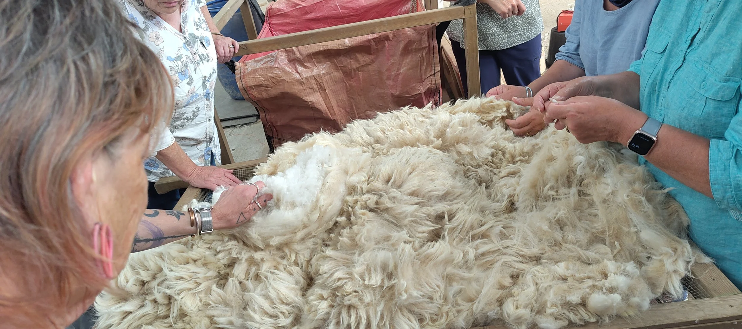 To start our day we were given a guided tour of the farm by David, whose passion for his alpaca and their welfare shone through every phrase. His talk was informative and peppered with entertaining anecdotes. Of their flock, the main fleece providers are twenty male Huacaya alpaca who we met en masse in the field. Eko Alpaca also has several rare Guanaco camelids, whose fibre is extremely fine and of high value, similar to Vicuña. However, these are very strong and able to jump a deer fence, and David entertained us with the story of how after rescuing eleven Guanaco, they escaped on arrival, requiring the help of a local wrangler to round them up. In line with their beliefs, they keep their alpaca as long as they are healthy, and have several late ‘teenagers’ still living on the farm. When we met the female herd, this was evidenced by ‘Lydia’ an eighteen-year-old who still produces a usable, if inferior, fleece, but David explained that on average, the males produce the best fibre.